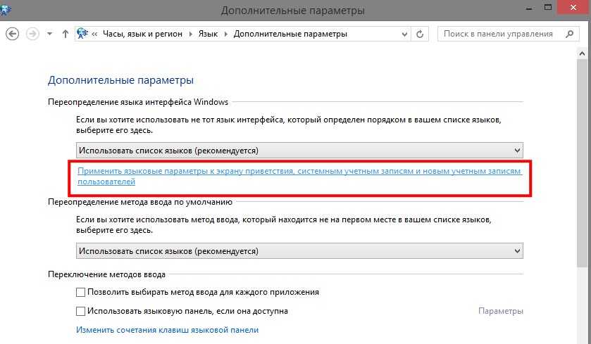 Доступ ко всем языковым параметрам можно получить, щелкнув «Настройки языка» на языковой панели, или поискав в панели управления язык. Дальше в левой панели ссылка «Дополнительные параметры» откроет вам путь в светлое будущее.