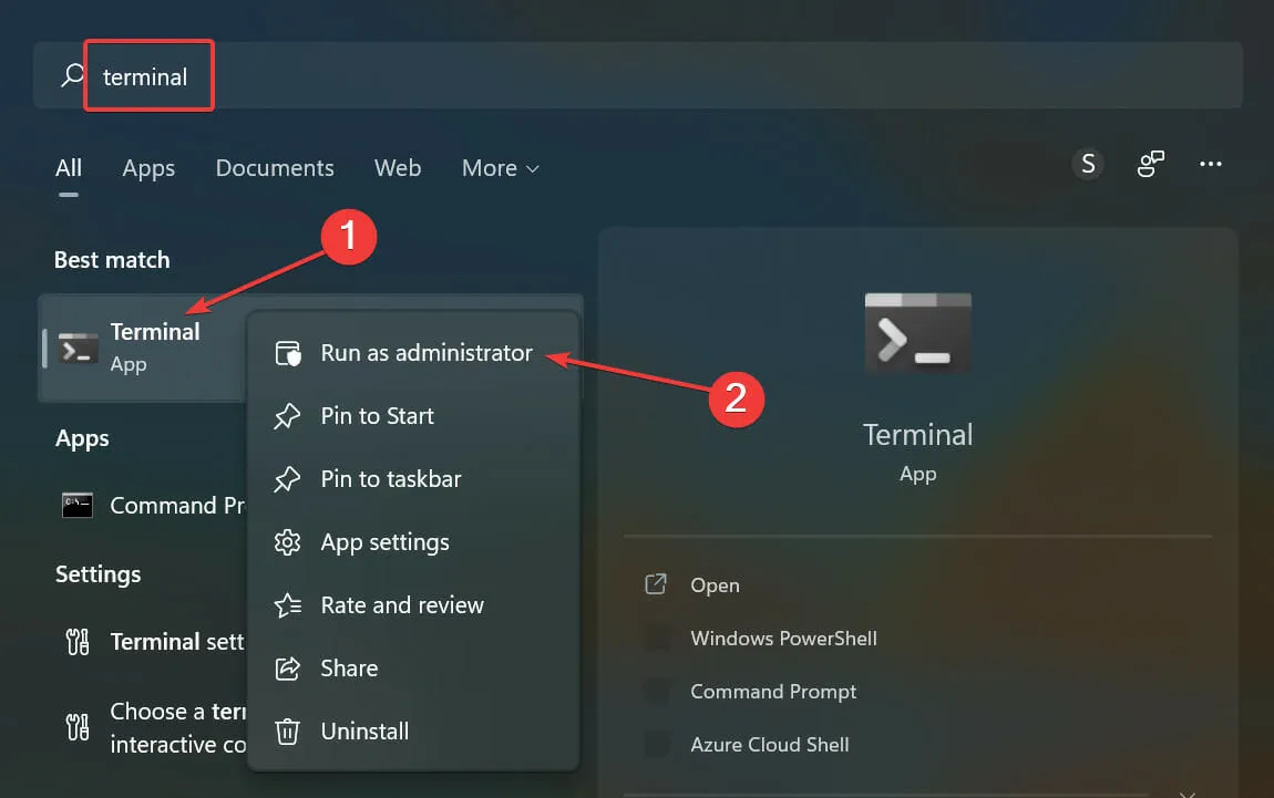 Нажмите Windows+ S, чтобы запустить меню поиска, введите «Терминал» в текстовое поле вверху, щелкните правой кнопкой мыши соответствующий результат поиска и выберите «Запуск от имени администратора» в контекстном меню.