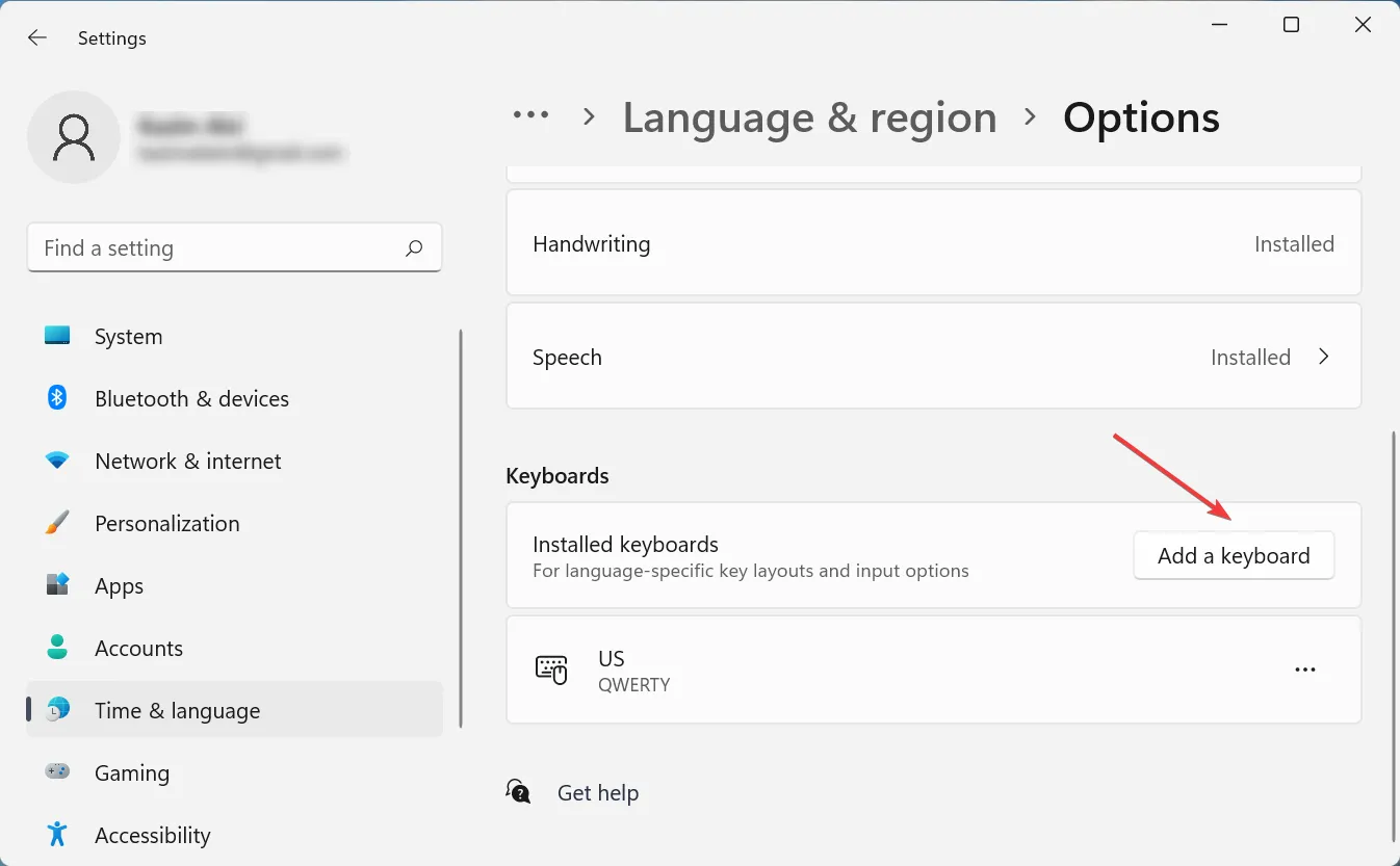 Нажмите кнопку «Добавить клавиатуру» рядом с «Установленные клавиатуры».