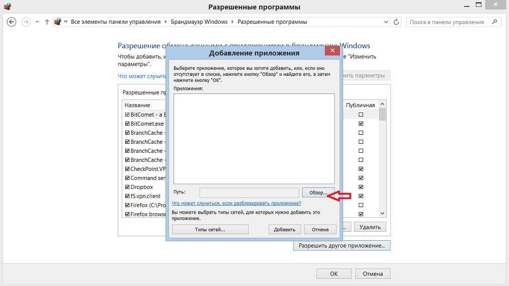 Если программы, для которой вы хотите создать исключение нет в представленном списке можно сделать следующее: Щелкните кнопку «Разрешить другое приложение». Затем нажмите кнопку «Обзор» и выберите главный исполняемый файл с расширением.exe, который нужно добавить в список.