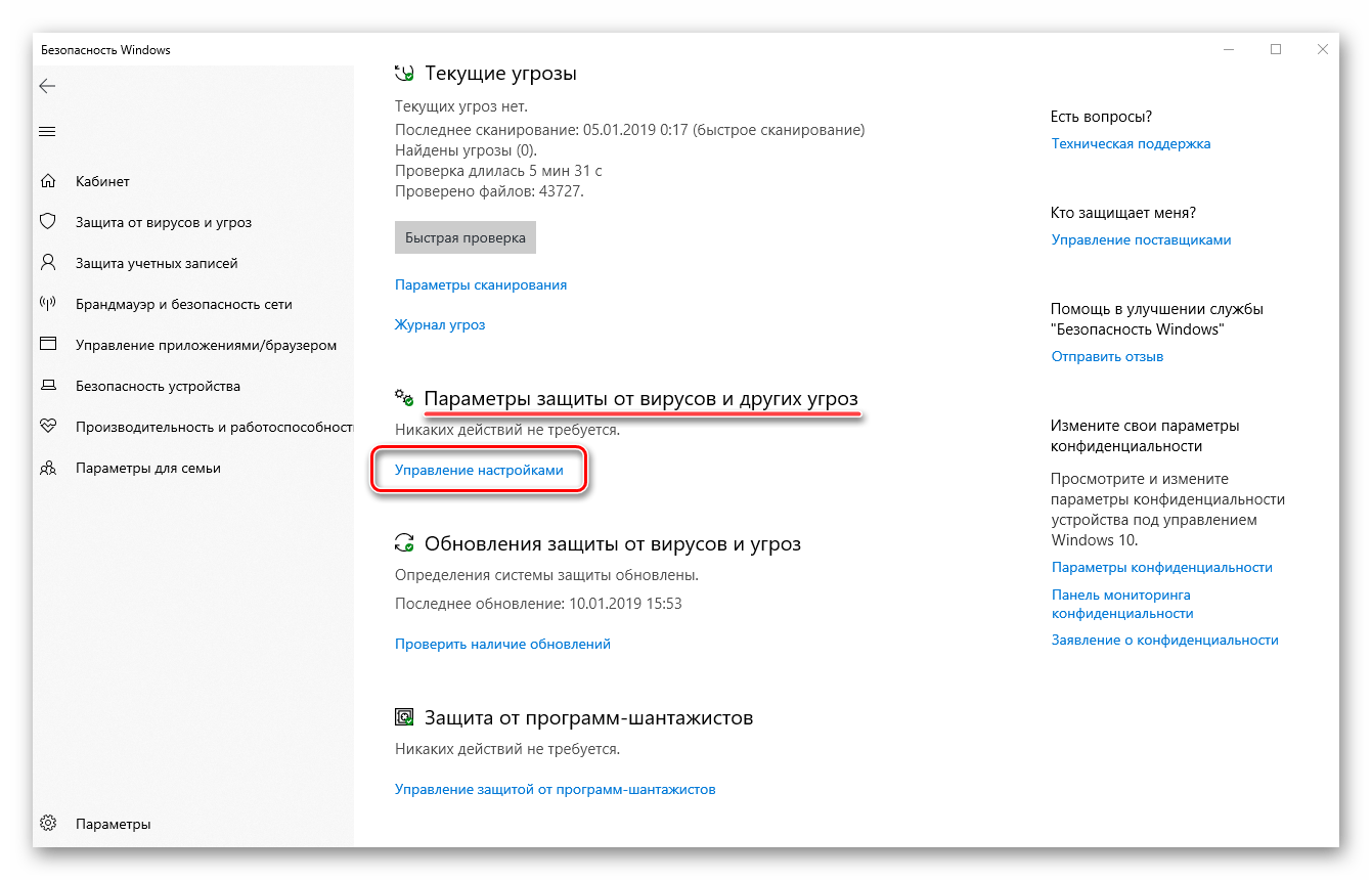 Ищем Параметры защиты от вирусов и других угроз и переходим в Управление настройками…