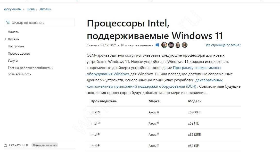 - Для Intel — docs.microsoft.com/en-us/windows-hardware/design/minimum/supported/windows-11-supported-intel-processors.