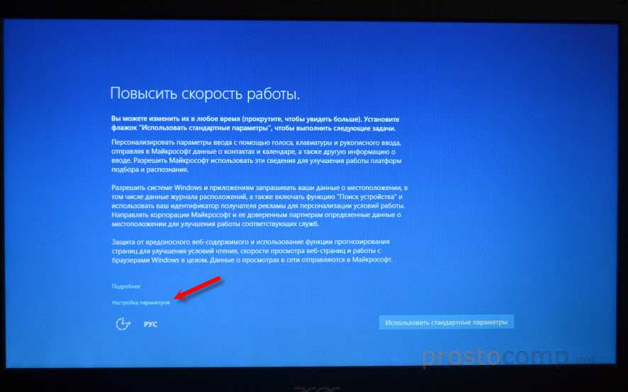 Первое окно – настройка параметров. Не советую выбирать «Использовать стандартные параметры». Нажмите на «Настройка параметров». Там можно отключить много ненужно. Так званную слежку Windows 10, которой все так боятся