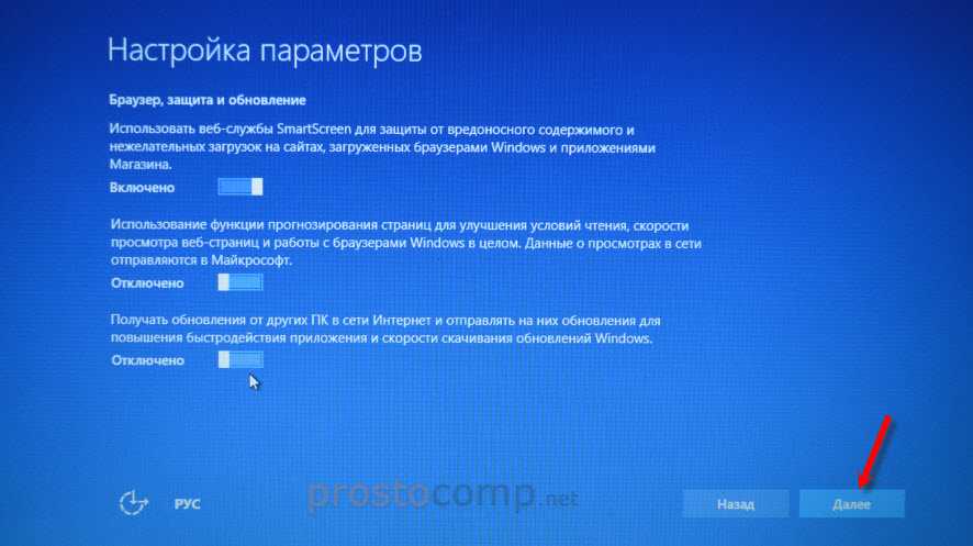 На последней странице оставил включенной только веб-службу SmartScreen.