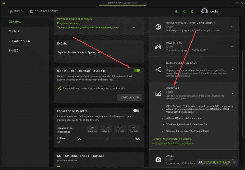 Первый из них позволит нам активировать или деактивировать оверлейный экран NVIDIA в играх, а второй сообщит нам, соответствуем ли мы всем требованиям и готовы ли эффекты Freestyle к использованию.