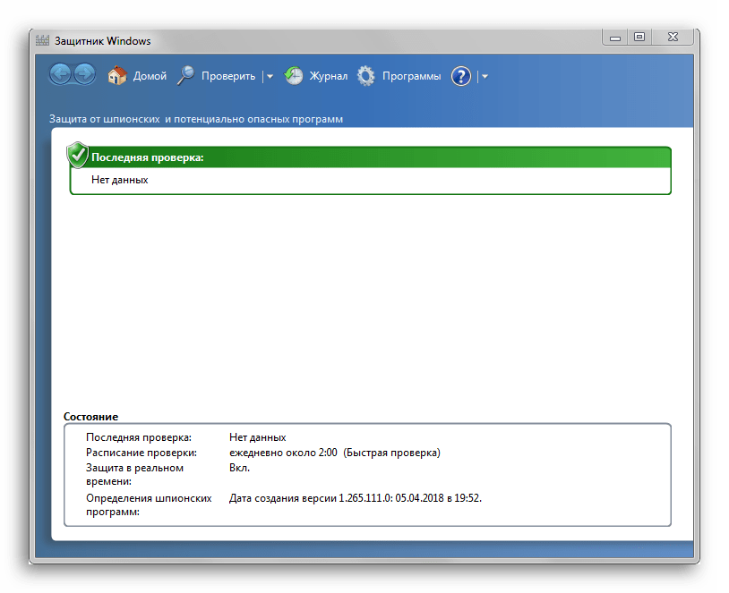 В самом низу окна находится гиперссылка «Открыть Защитник Windows», которая позволяет показать рабочее окно Defender. Здесь вы можете проследить за ходом обновлений и проверок, а так же назначить внеплановую проверку.