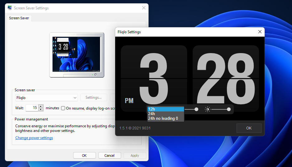 Вы также можете настроить дополнительные параметры для заставки Fliqo. Для этого нажмите кнопку «Настройки» в окне «Настройки заставки». Затем вы можете изменить формат часов, нажав кнопку «Формат часов» в окне, показанном непосредственно ниже. Перетащите ползунок шкалы масштаба влево и вправо, чтобы отрегулировать размер часов. Вы можете изменить яркость, перетащив ползунок на панели яркости. Нажмите OK, чтобы закрыть настройки Fliqo, и выберите Применить, чтобы сохранить их.