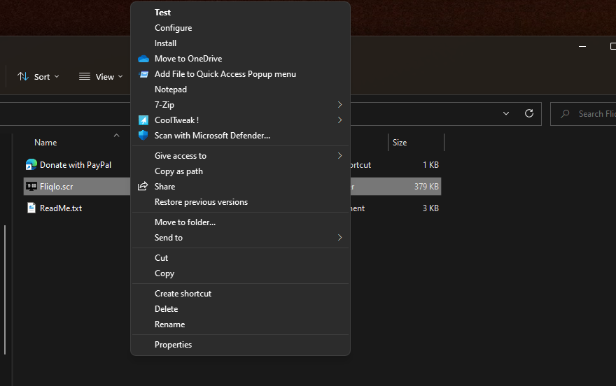 Щелкните правой кнопкой мыши файл заставки Fliqo.scr в извлеченной папке, чтобы выбрать Показать дополнительные параметры.