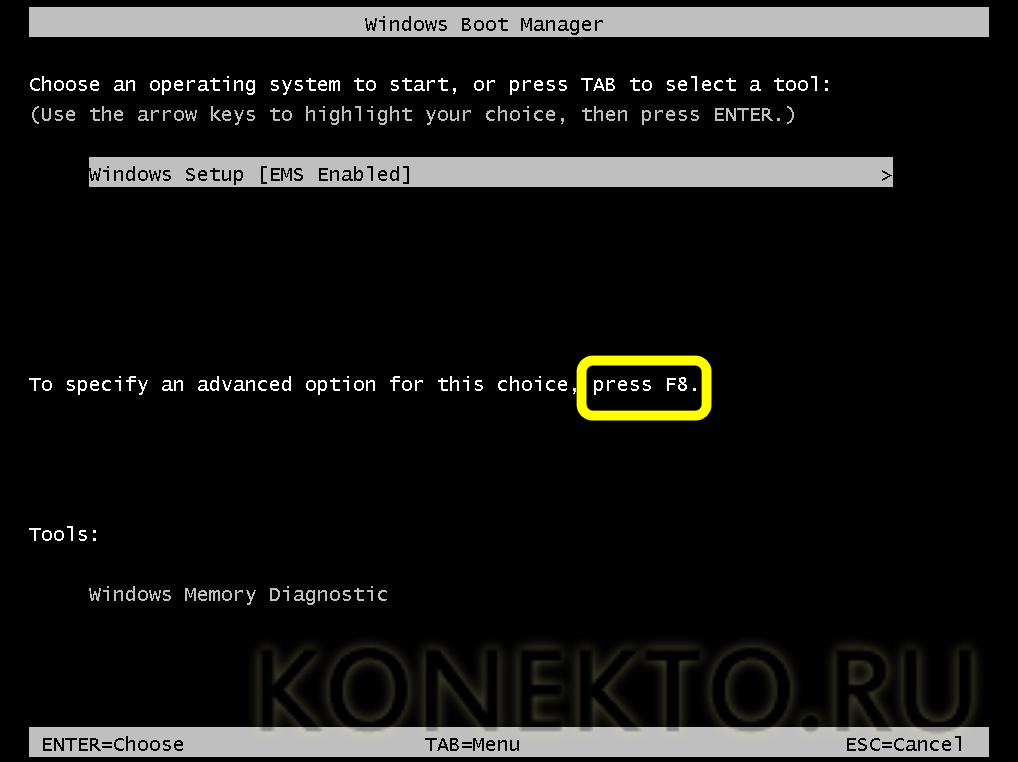 Включить загрузку с диска или флешки, нажав любую клавишу перед запуском с диска, дождаться стартового экрана и воспользоваться кнопкой F8.