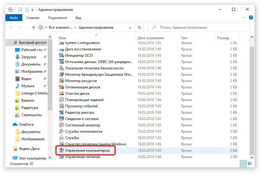 - Перейти в раздел «Администрирование» и запустить компонент «Управление компьютером».