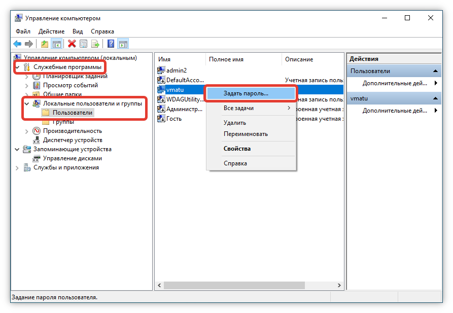 Теперь, согласно скриншоту, следует зайти в контекстное меню нужной учетной записи и задать пароль.
