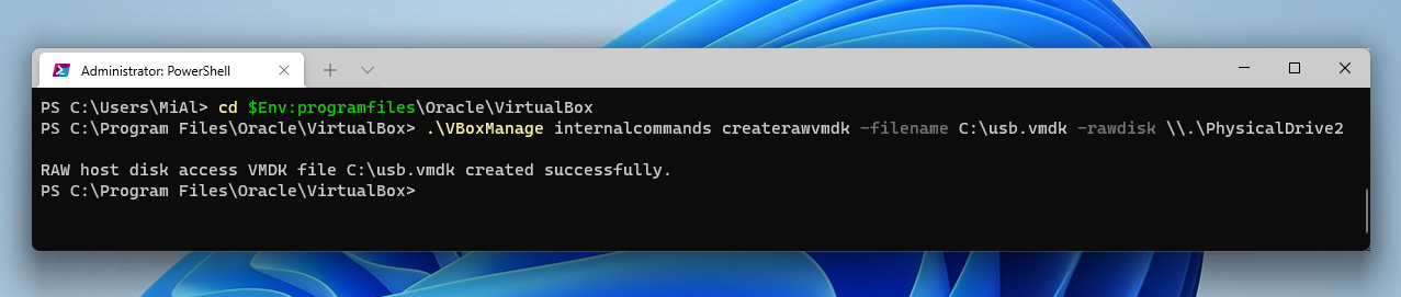 .\VBoxManage internalcommands createrawvmdk -filename C:\usb.vmdk -rawdisk \\.\PhysicalDrive2