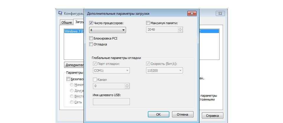 - откройте вкладку «Загрузка» и выберите «Дополнительные параметры», а в ней снимите галочку с пункта «Максимум памяти».