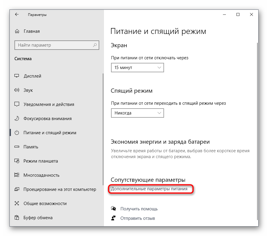 - Перейти в «Параметры» – «Система» – «Питание и спящий режим» – «Дополнительные параметры питания».