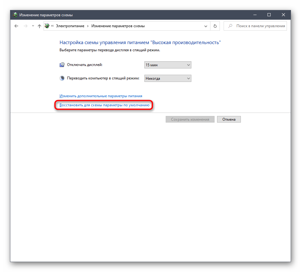 В противном случае перейдите к «Настройка схемы электропитания», нажав по соответствующей надписи возле активной настройки. Там щелкните по «Восстановить для схемы параметры по умолчанию» и подтвердите внесение изменений.
