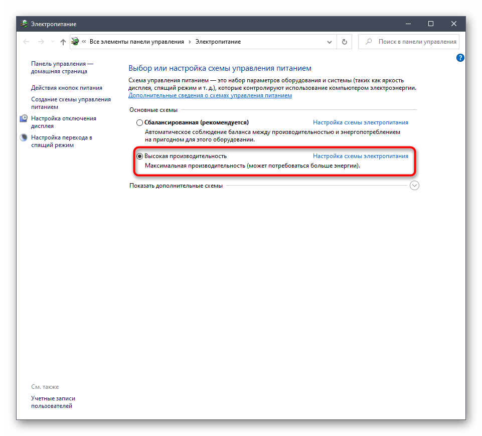 В предпоследнем способе нашего сегодняшнего материала хотим поговорить о настройке плана электропитания. Здесь вы увидите два совета, связанных с этим аспектом операционной системы. Первый позволяет установить стандартную конфигурацию для максимальной производительности, а второй отвечает за сброс параметров до состояния по умолчанию и пригодится в тех случаях, когда пользователь изменял какие-то параметры плана.