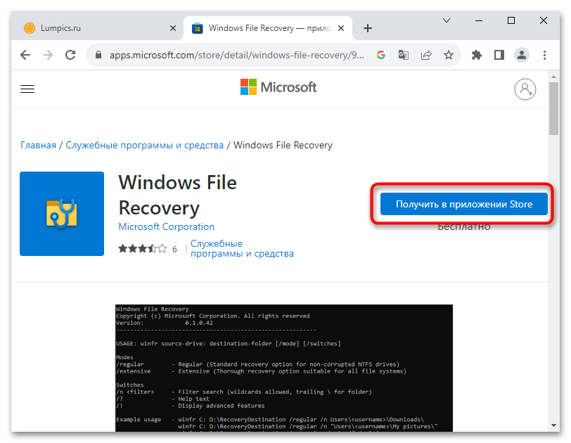 - Воспользуйтесь ссылкой выше для перехода к странице Windows File Recovery или отыщите приложение самостоятельно через Microsoft Store, затем выполните стандартную инсталляцию.