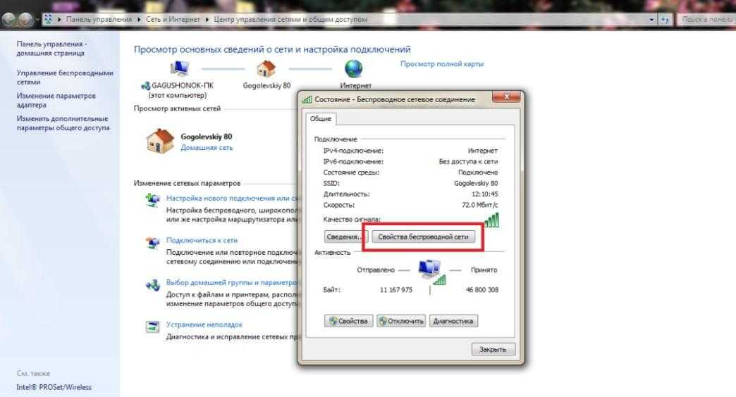 - найти пароль можно еще одним простым способом — обратиться к панели управления стационарного компьютера или ноутбука. Пользователю нужно попасть в раздел «Управления сетями и общим доступом». Далее необходимо перейти в раздел «Управление беспроводными сетями», найти там необходимую беспроводную сеть и через правую кнопку мыши в контекстном меню ознакомиться с пунктом «Свойства». В разделе «Безопасность» нужно напротив графы отображения вводимых знаков установить галочку, тем самым открывая доступ к ключу безопасности.