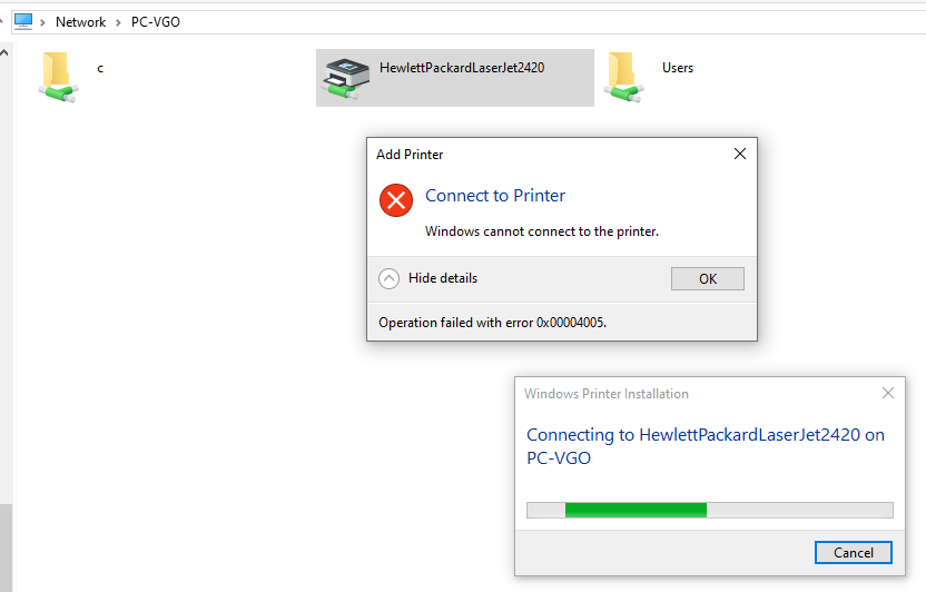 Попробуйте добавить принтер, установить для него драйвер — проверьте наличие ошибки 0x00004005.