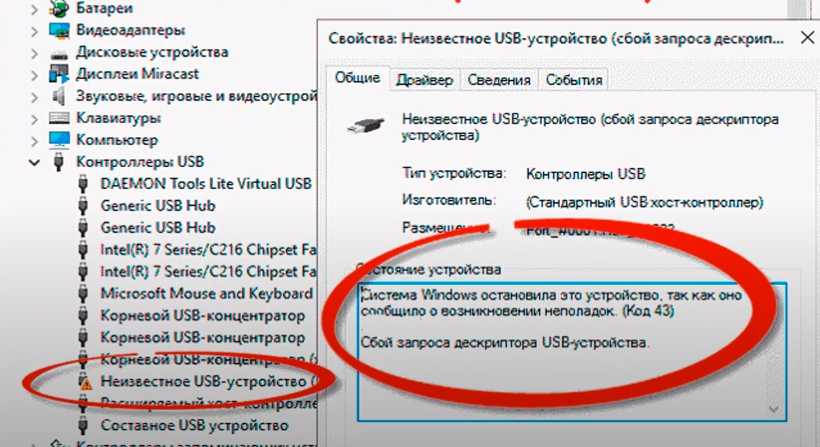 При открытии этого предупреждения также может быть указана причина его нестабильной работы — код ошибки 43.