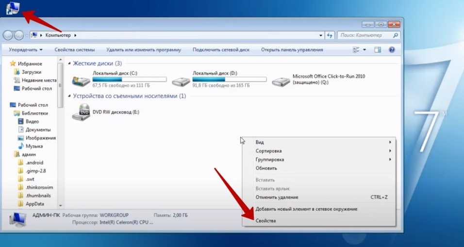 Если у вас более ранние версии ОС, например Windows 7, тогда щелкните по значку «Мой компьютер» на рабочем столе. В открывшемся окне на пустом поле с помощью мышки вызовите меню и выберите «Свойства».