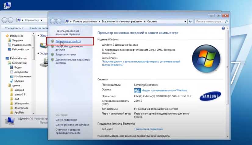 В новом меню с левой стороны выбираем «Диспетчер устройств».