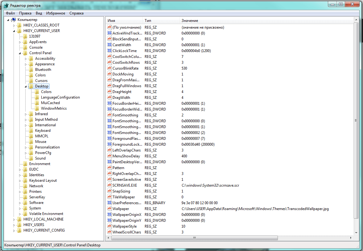 В левой области большого окна «Редактор реестра» следуем по дереву вкладок в каталог HKEY_CURRENT_USER\Control Panel\Desktop.