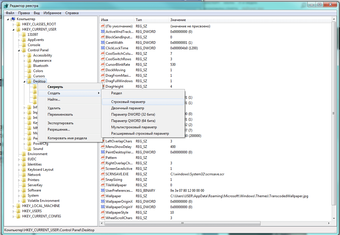 Если в правом окне нужные параметры отсутствуют, следует их создать. Для этого на названии папки Desktop в левой части нажимаем правую клавишу мышки и выбираем пункт меню «Создать», а затем «Строковый параметр».