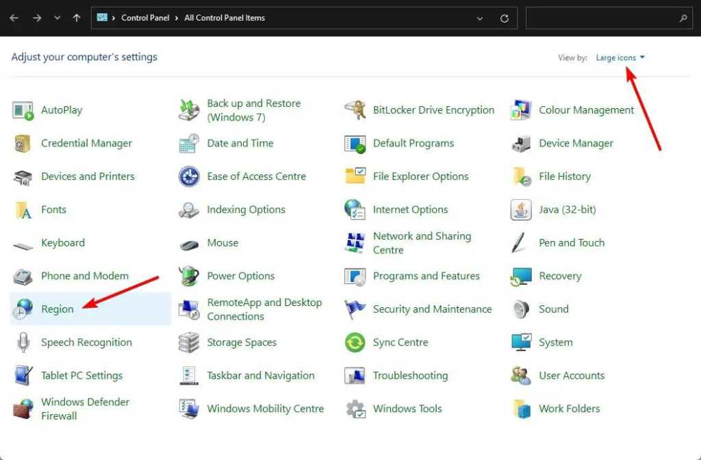 First, search for “Control Panel” in the Start menu and open it. Next, set the “View by” to “Large icons” and find & click on the “Region” option.