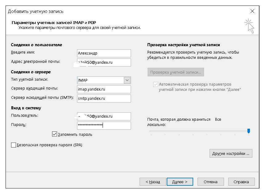 - Если у пользователя есть почтовый сервер и к нему можно подключиться, то следует ввести адрес и пароль.
