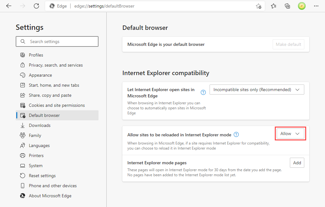 - Set the option “Allow sites to be reloaded in Internet Explorer mode” to: Allow.