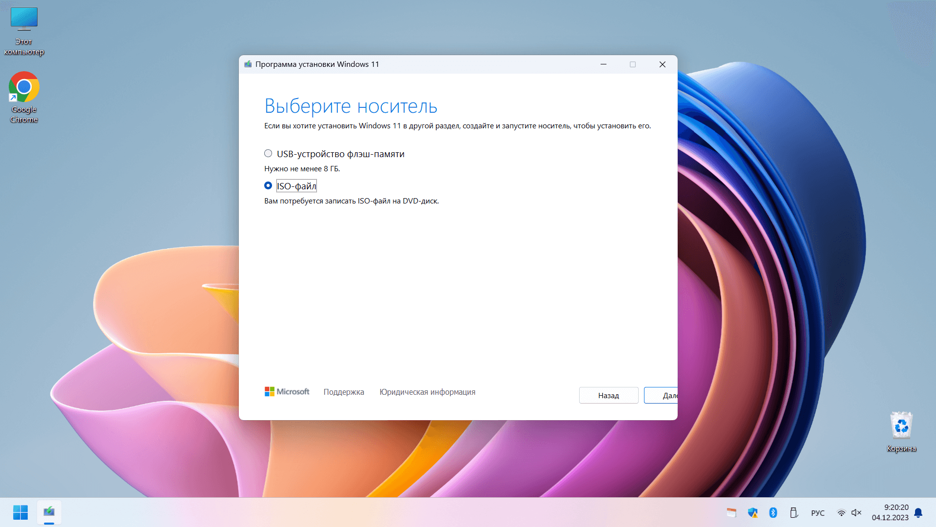 - В окне «Выберите носитель» укажите пункт «ISO-файл», а затем нажмите на кнопку «Далее».