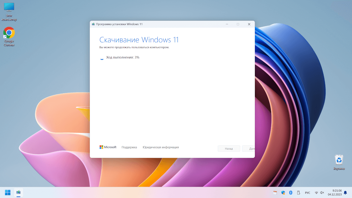 - Откроется окно «Скачивание Windows 11», в котором показан ход данной операции.