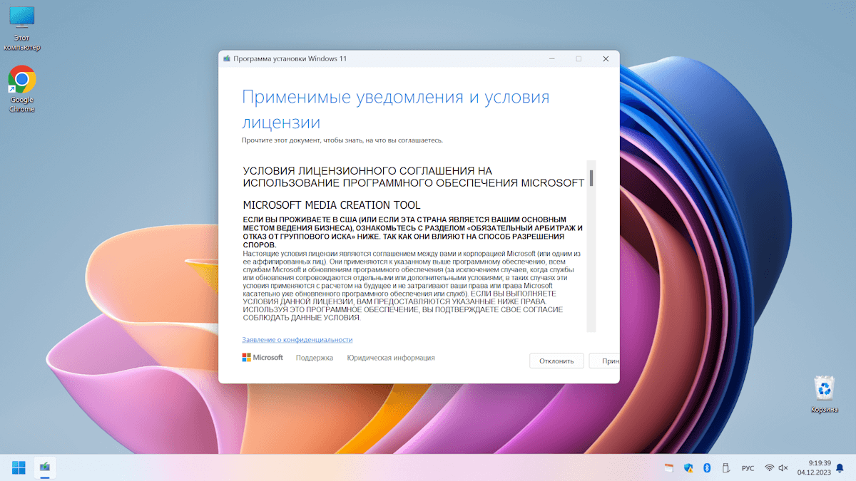 - В окне «Программа установки Windows 11» примите лицензионное соглашение «Применимые уведомления и условия лицензии».