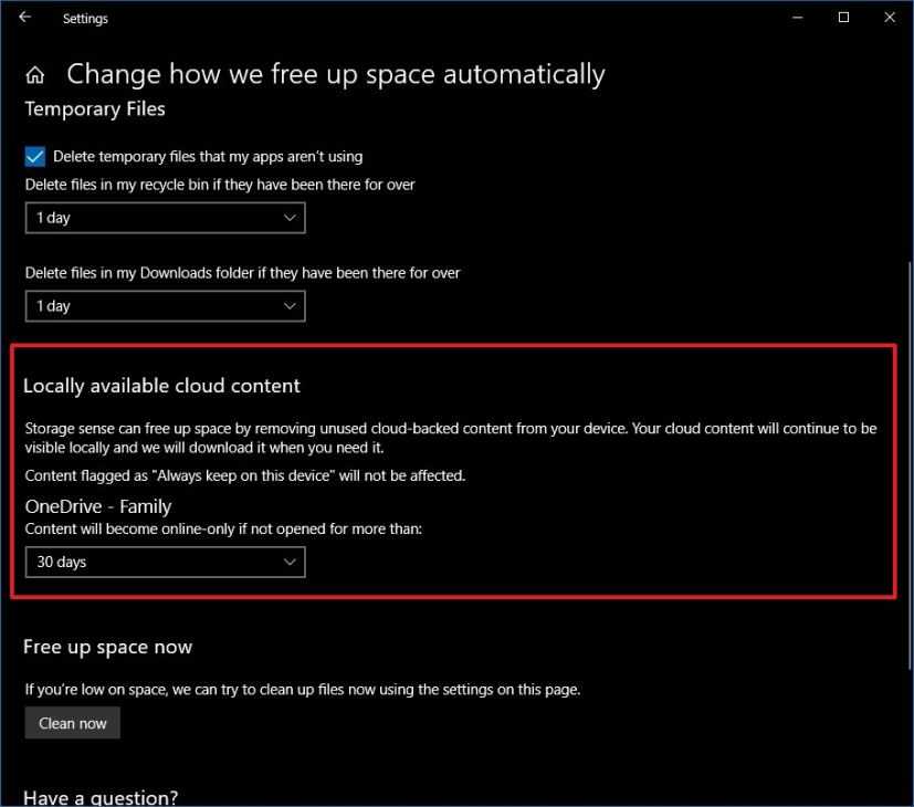 Storage sense with OneDrive option on Windows 10 October 2018 Update