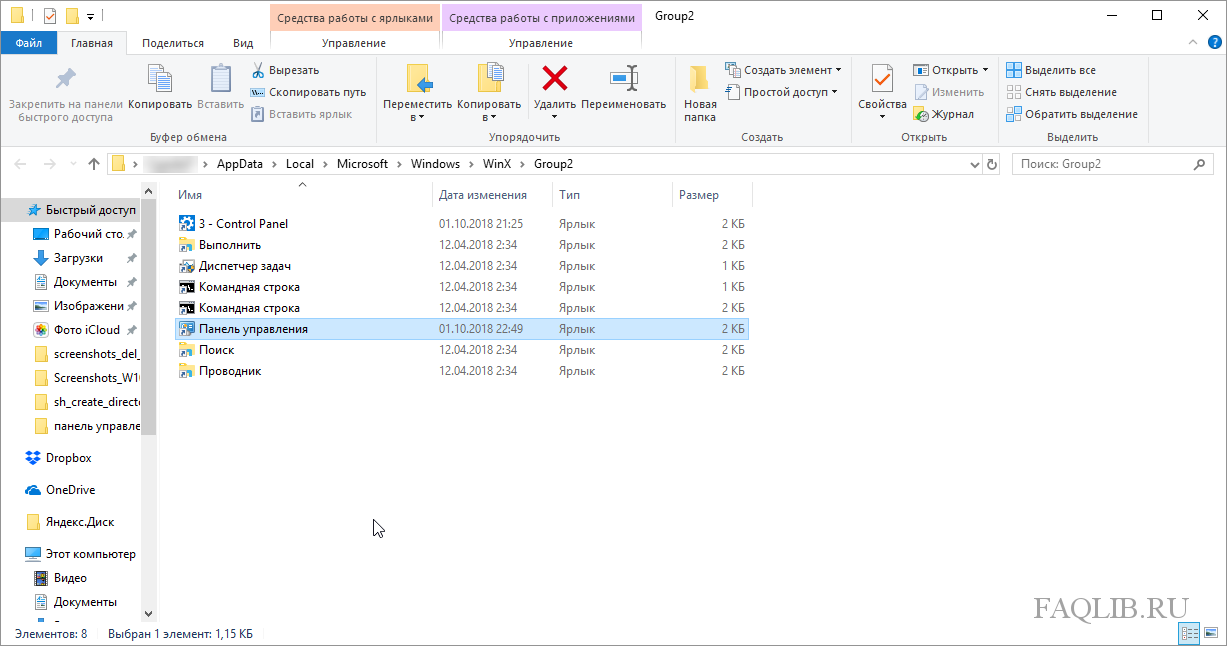 Также можно скопировать эти ярлыки из предыдущих версий Windows, начиная с windows 8. Копируем с компьютера донера ярлык Панель управления из папки %userprofile%\AppData\Local\Microsoft\Windows\WinX\Group2 на диск C или D нужного компьютера. Получившийся ярлык 4 — Control Panel переименовываем в допустим 5 — Control Panel.Далее копируем ярлыки в %userprofile%\AppData\Local\Microsoft\Windows\WinX\Group2.Нужный ярлык появится после перезагрузки компьютера.