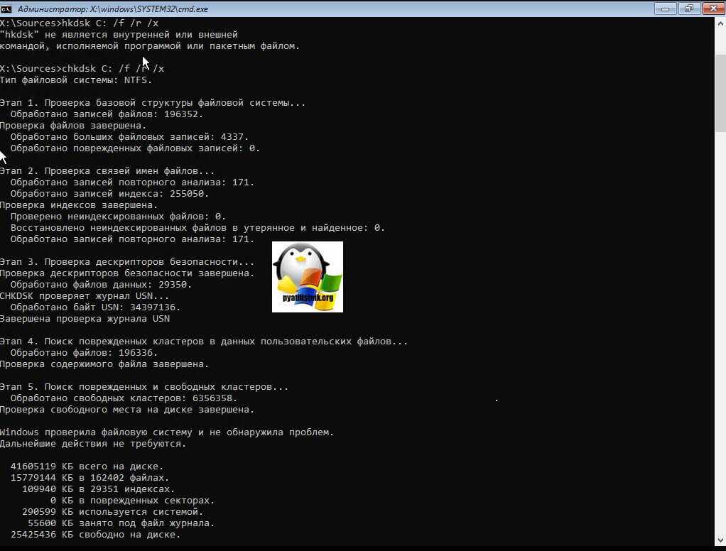 Если целостность не нарушена или не удалось восстановить, то попробуем устранить код ошибки 0xc0000098 через проверку жесткого диска на предмет битых секторов или повреждения файловой системы. Для этого в Windows 7-10 есть утилита командной строки chkdsk. Введите команду: