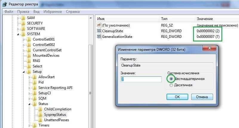 справа проверьте значение REG_DWORD параметра CleanupState. Должно быть 2. Тут же ищем параметр GeneralizationState. У него значение поставьте 7. Вот так:
