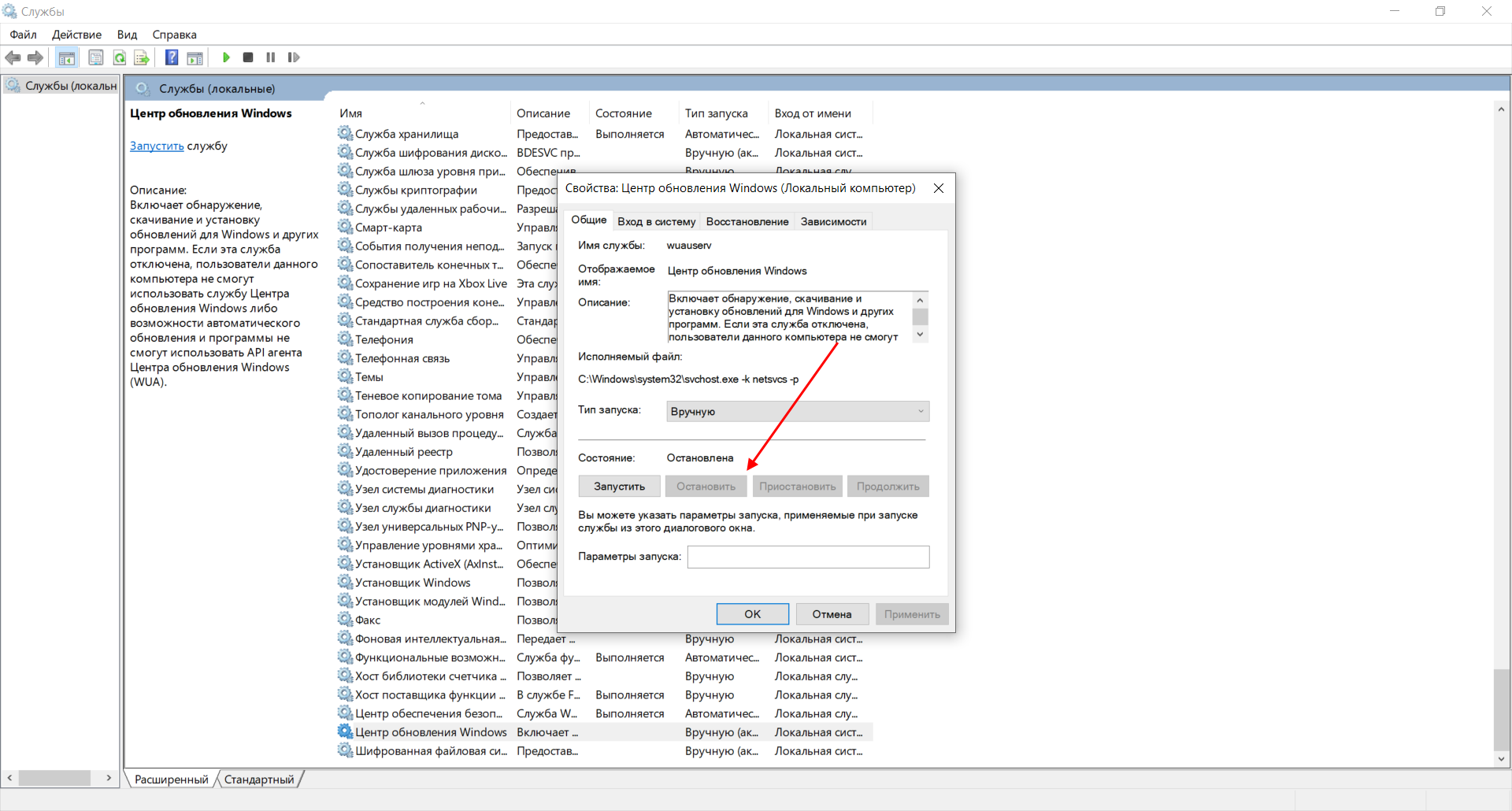 Остановка службы центр обновлений