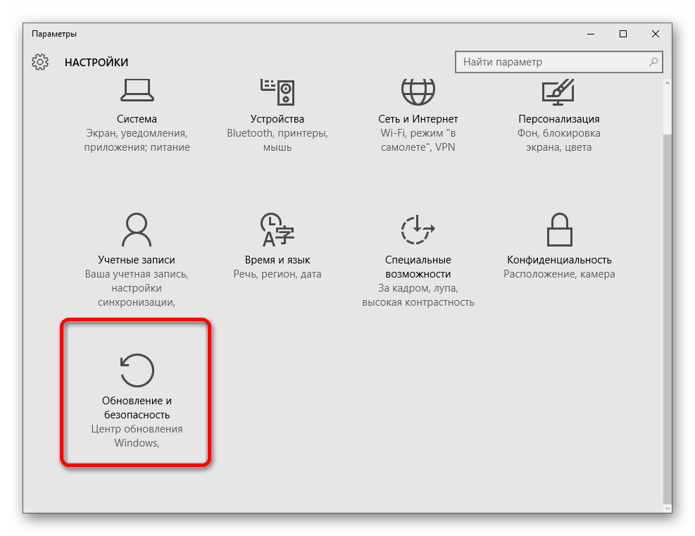 - Зажимаем на клавиатуре комбинацию клавиш «Win+I», где Win – клавиша с логотипом Windows, расположенная в нижней левой части клавиатуры. Таким образом мы попадаем в параметры системы – оттуда переходим в раздел «Обновление и безопасность».