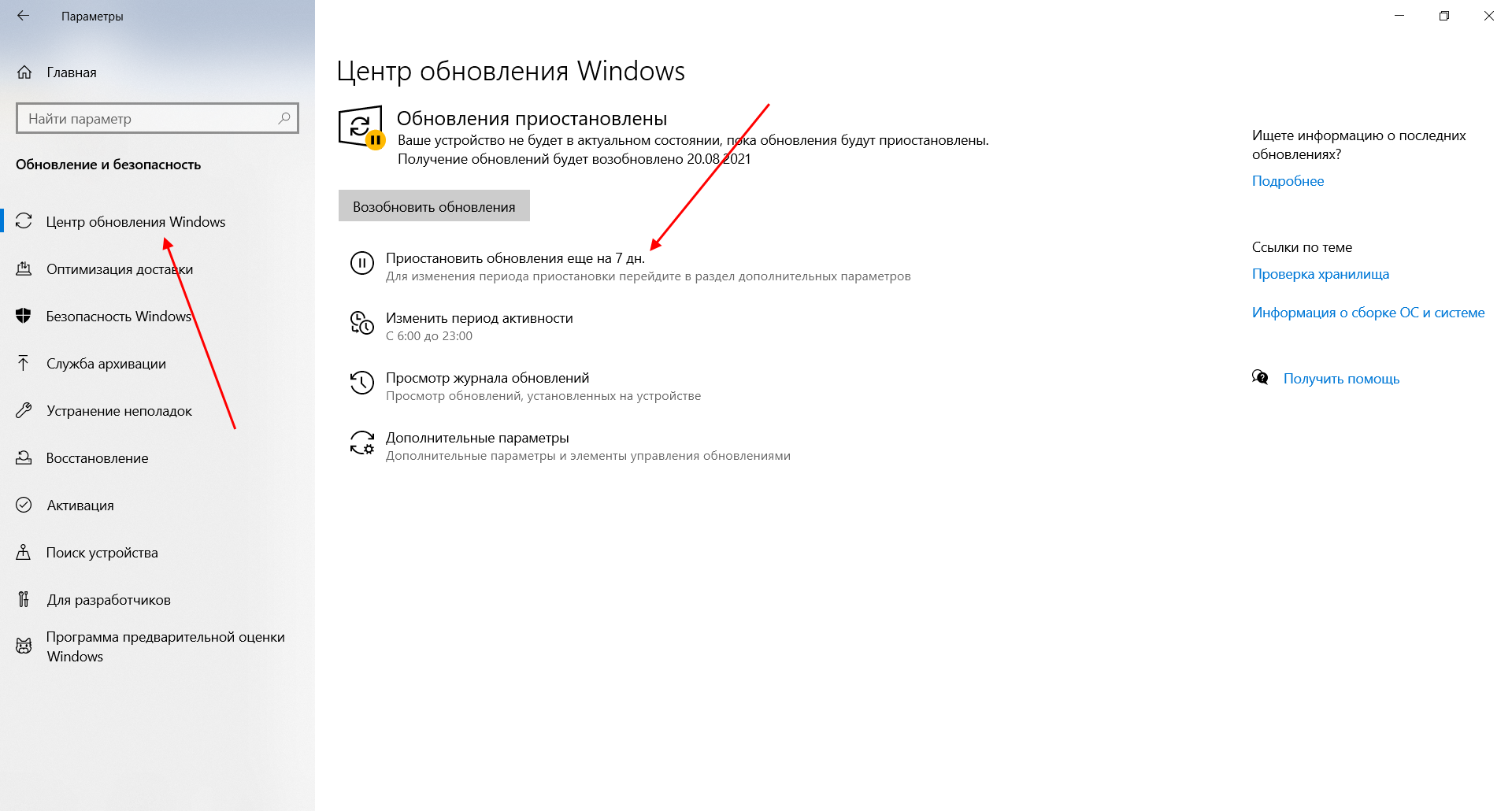 Для этого необходимо перейти в параметры компьютера (комбинация клавиш WIN+I), открыть раздел «Обновление и безопасность» и в подразделе «Центр обновление Windows» воспользоваться функцией «Приостановить обновление на 7 дн.».