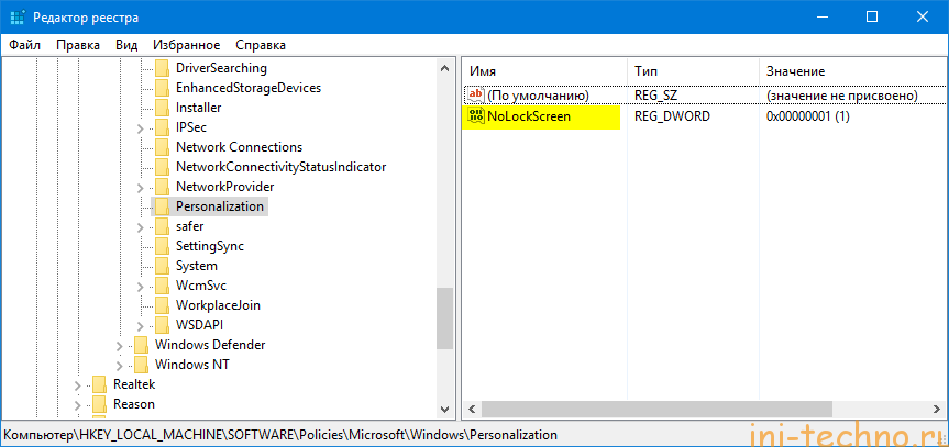- В последней папке с параметрами персонализации будет находиться запись NoLockScreen — щёлкните по ней правой клавишей. В контекстном меню выберите опцию удаления.