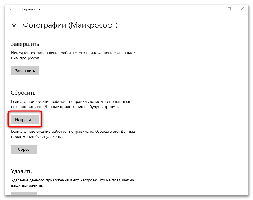 В новом окне сначала нажмите на кнопку «Исправить», после чего система попытается вернуть состояние приложения, не затронув данные.