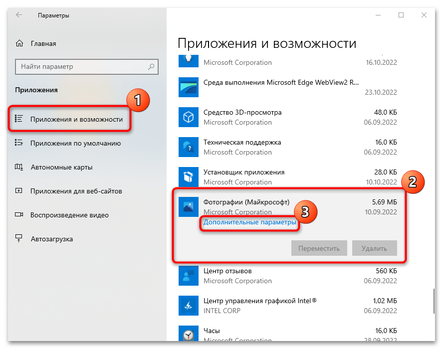 - Запустите «Параметры» через главное меню и перейдите в раздел «Приложения». На вкладке «Приложения и возможности» в списке установленного софта найдите «Фотографии». Кликните по названию левой кнопкой мыши, затем ей же по появившейся строке «Дополнительные параметры».