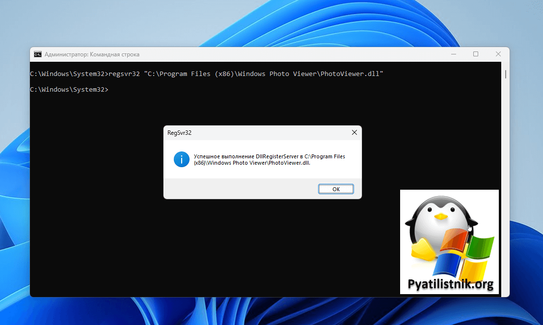 У вас должно появится сообщение, что «Успешное выполнение DllRegisterServer в C:\Program Files (x86)\Windows Photo Viewer\PhotoViewer.dll»