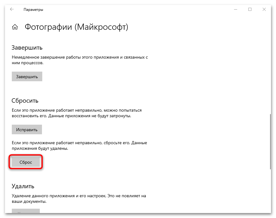 Если это не сработало, то выберите «Сброс», при котором все настройки и данные «Фотографий» будут удалены.