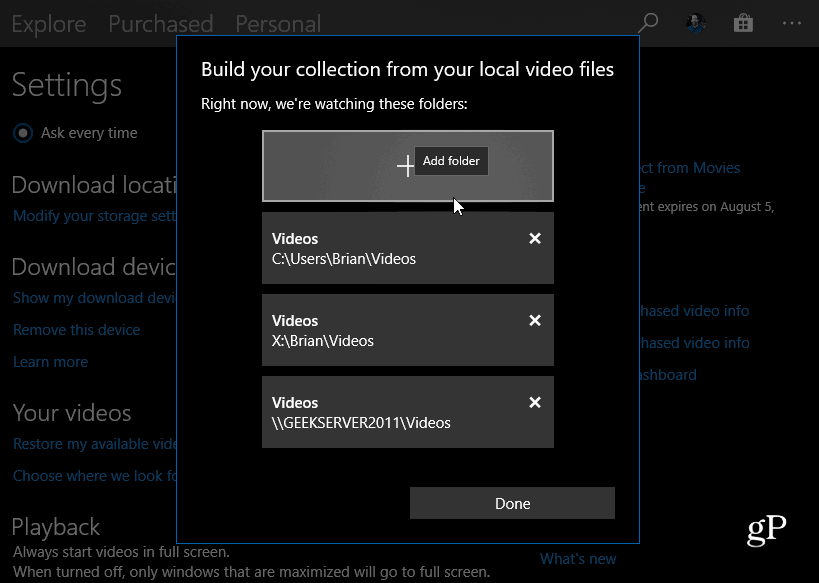 Вы также можете указать приложению, где искать ваши видео. Этот процесс аналогичен указанию Groove Music, где искать ваши музыкальные файлы. Запустите Movies & TV и перейдите к Настройки > Выберите, где искать видео и добавьте местоположение вашей коллекции.