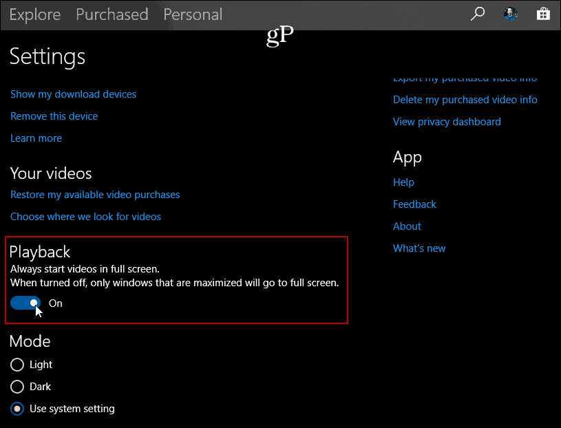 Если вы обнаружите, что используете его больше, вы можете захотеть, чтобы фильмы всегда воспроизводились в полноэкранном режиме, когда вы готовы посмотреть фильм. Запустите приложение «Кино и ТВ», щелкните значок «Дополнительные параметры» (…), а затем выберите «Настройки» в меню. Затем прокрутите вниз и включите переключатель «Воспроизведение». Это заставит видео всегда запускаться в полноэкранном режиме. Независимо от того, есть ли у вас высококачественный дисплей 4K или нет, приятно знать, что вы можете сделать так, чтобы фильмы всегда воспроизводились в полноэкранном режиме для лучшего просмотра.