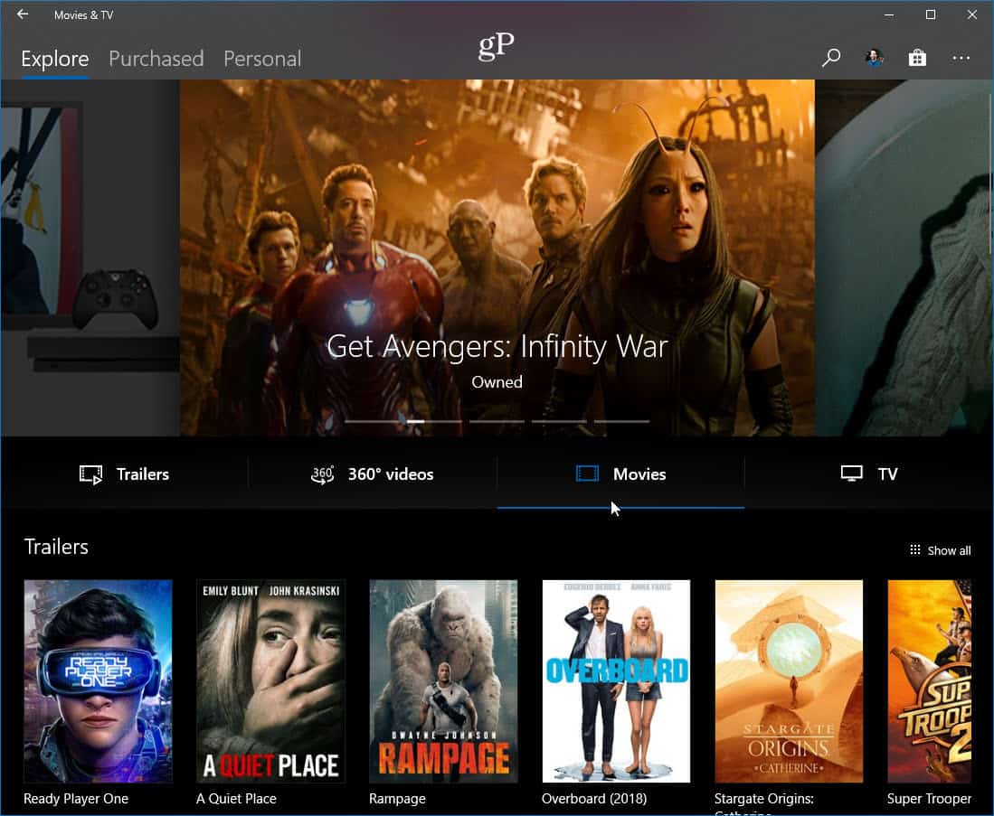 Приложение Movies & TV отображает подборку мультимедиа, которое, по вашему мнению, вы хотели бы посмотреть, в том числе трейлеры к фильмам и видео на 360 градусов. Все, что вы видите, доступно для скачивания, аренды или бесплатно.