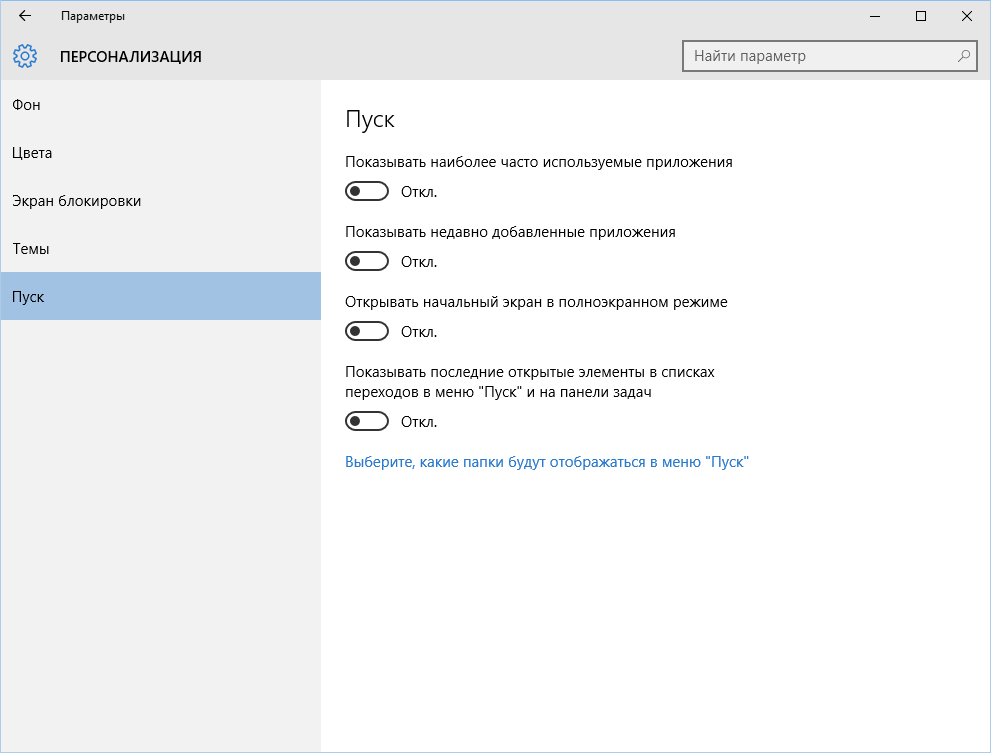 Теперь переходим к Windows 10. Отключить список недавно добавленных и часто используемых приложений можно через окно «Параметры». Открой его и перейди в раздел «Персонализация», пункт «Пуск». Отключи все, что там есть.